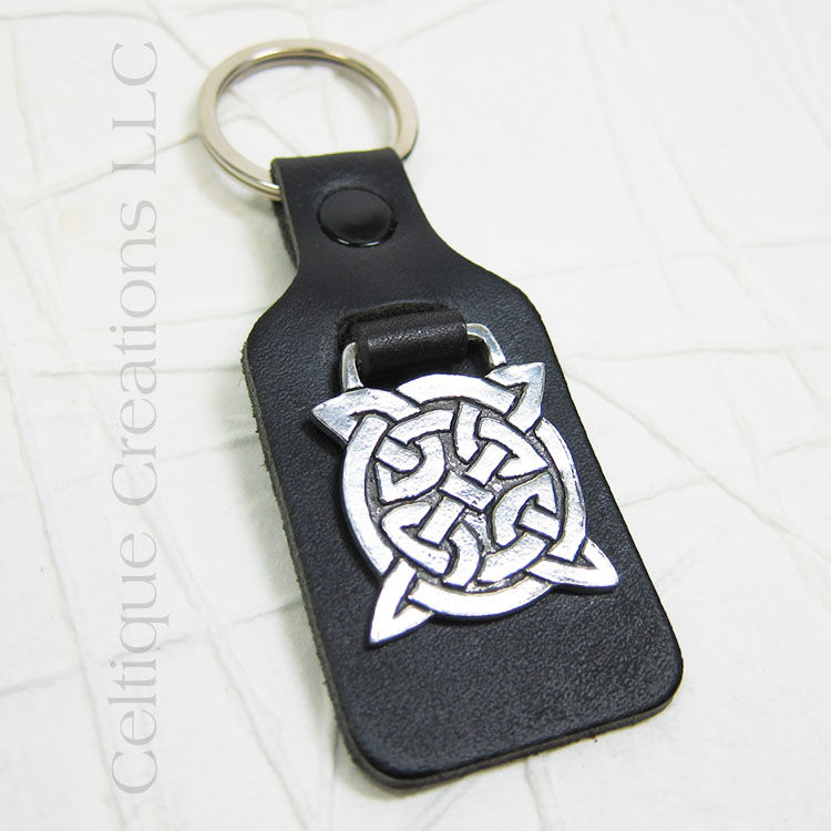 This lovely key ring is made of high quality pewter and leather. It was made in the UK and has a good weight and hand feel. If you are looking for a rich looking key fob, this is for you. It features a beautiful square Celtic knot made out of pewter which hangs on a black leather background.